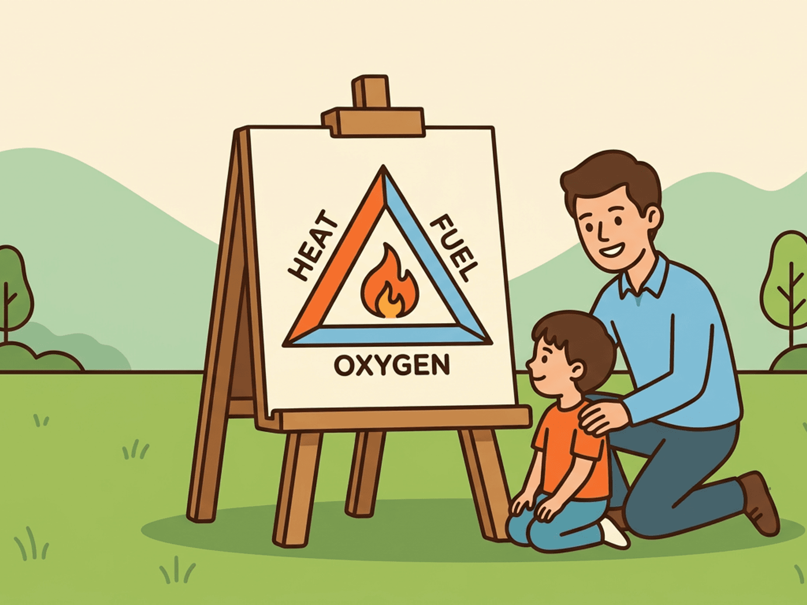 Fires need three things at once: heat, fuel, and oxygen. Friction kits add heat by rubbing wood; dry fuel catches when it reaches its ignition temperature; oxygen from the air feeds combustion. The ideas are real science—explained here in plain language—and every experiment belongs outdoors with an adult.